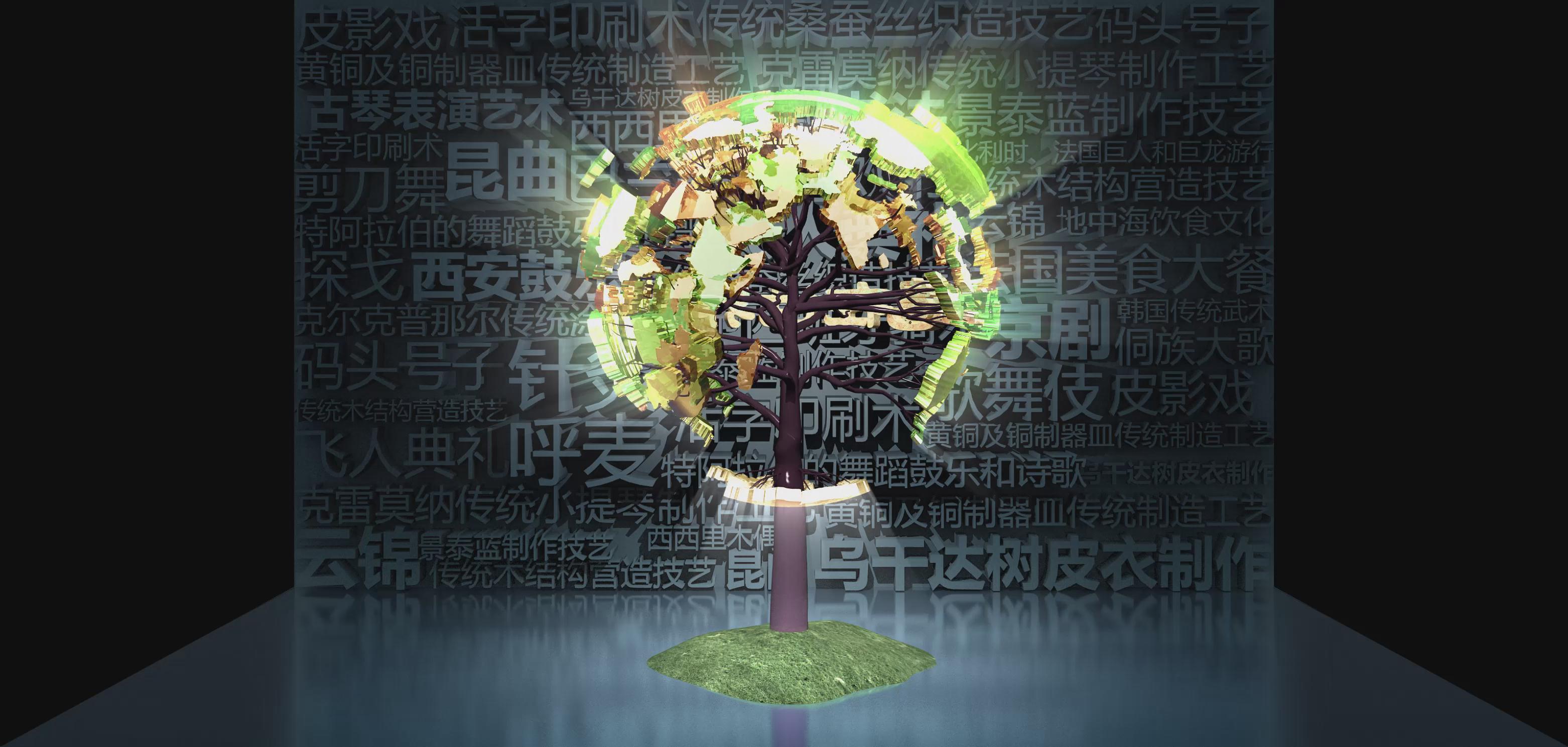截止2017年6月,中國(guó)已有39個(gè)項(xiàng)目躋身世界級(jí)非物質(zhì)文化遺產(chǎn),項(xiàng)目總數(shù)位居世界第一。其中,人類非物質(zhì)文化遺產(chǎn)代表作名錄31項(xiàng),急需保護(hù)的非物質(zhì)文化遺產(chǎn)名錄7項(xiàng),非物質(zhì)文化遺產(chǎn)優(yōu)秀實(shí)踐名冊(cè)1項(xiàng)。 以折幕形式向大眾展示世界非物質(zhì)文化遺產(chǎn),在背景圖中列出了多種非遺事項(xiàng),結(jié)合立體模板大樹的形式,讓大家可以了解中國(guó)的非遺項(xiàng)目。