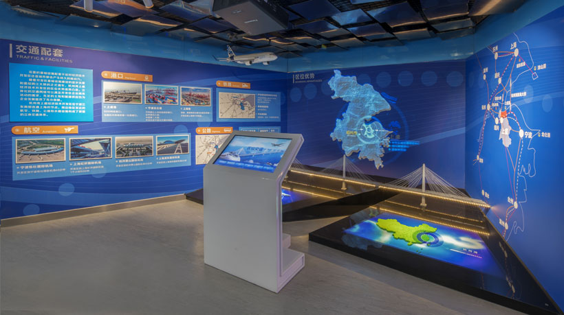 主形象墻:展廳名稱、序言。LED屏:杭州灣上虞經濟開發區總體形象宣傳。9屏拼接:各級領導視察園區照片和相關媒體報道,32寸觸控一體機、墻面沙盤模型、圖文觀看圖版及模型。可在觸摸屏中查詢杭州灣上虞經濟技術開發區的詳細概況內容,沙盤演示杭州灣上虞經濟開發區在長三角所處的位置,及海陸空各交通線路。新舊對比:觀眾揮動手臂,擦除老照片,顯示開發區新照片,產業布局:65寸透明屏*1、圖文版,展示先進裝備、汽車及關鍵零部件、綠色電子電器、新能源新材料、生物醫藥、現代服務業等產業基地在開發區的布局和規劃。招商引資:32寸觸控一體機*2、46寸觸控一體機*1、拼接屏*9展示政策優勢、完善配套、服務體系、科技創新。